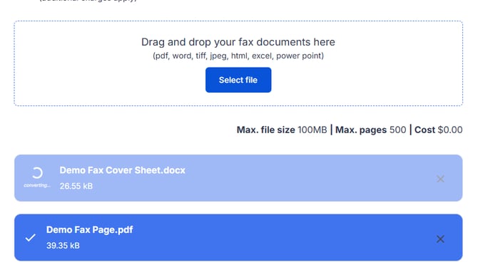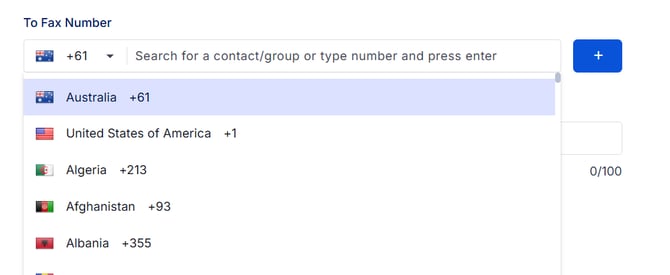 - Enter the destination fax number (select the country code from the dropdown)