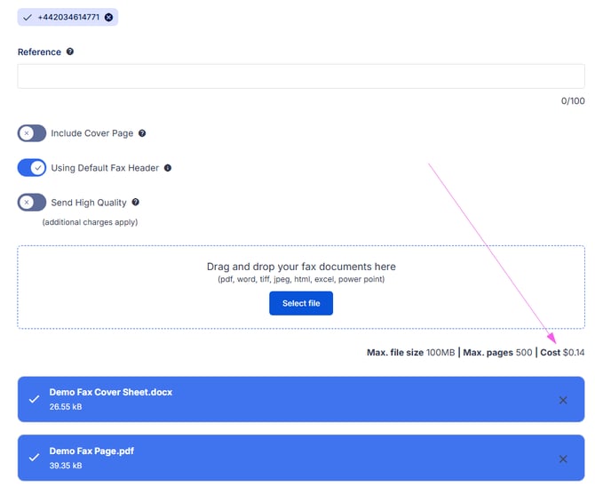 💡 This allows you to preview the cost before sending, helping you manage your account balance and avoid unexpected charges.For example:If you send 2 fax pages to a United Kingdom fax number, the estimated cost will be $0.16 AUD.If you enable high-quality fax the cost will increase to $0.18 AUD.