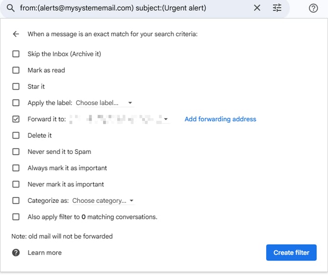 - Enter the forwarding criteria (e.g. emails with subject “Urgent alert” or from a specific sender)