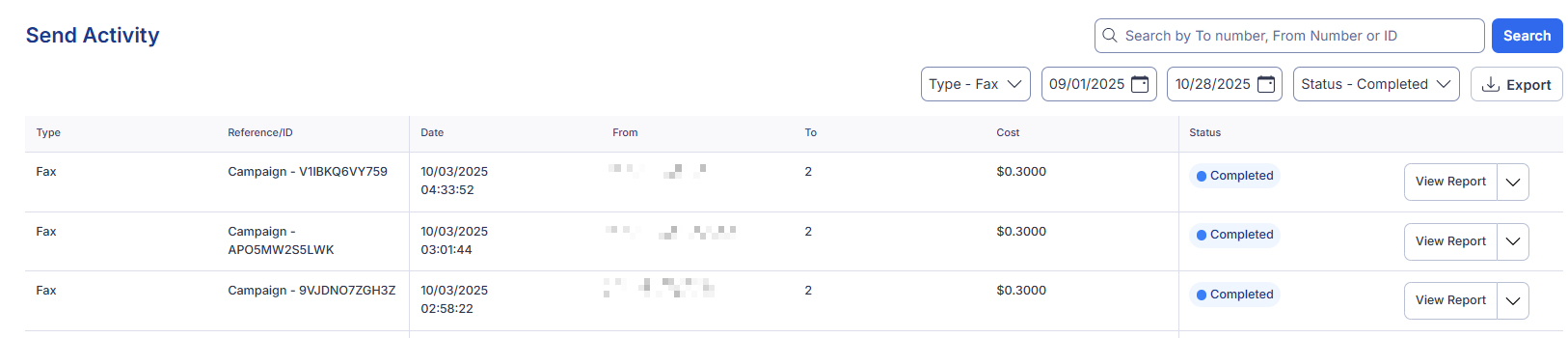 - Find the desired fax broadcast using the filters and click View Report.