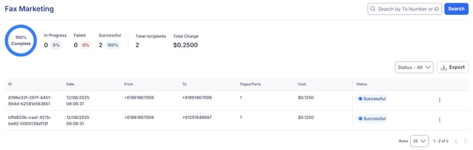 This combined data helps you track delivery success, costs, timing, and troubleshoot issues, enabling you to optimise your fax broadcasts and maintain fax compliance.