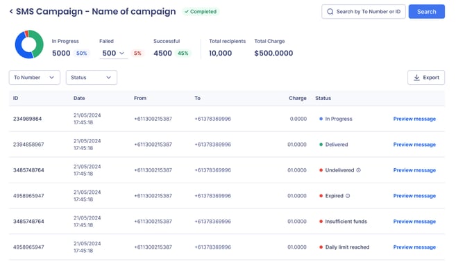 The SMS broadcast report in your Notifyre account provides a comprehensive overview of each SMS campaign’s performance. Access key metrics, including a visual breakdown of SMS statuses and total charges.