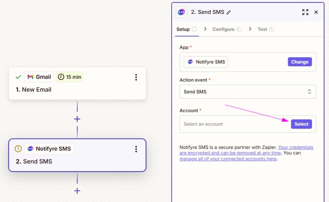 - Add Notifyre SMS as the event App and Send SMS as the action event
