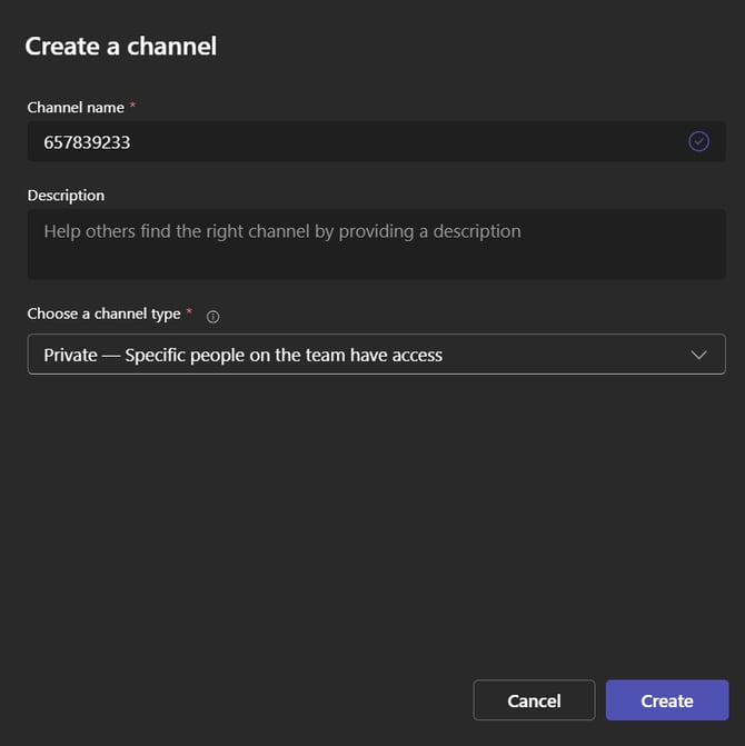 - Enter a name for your Team that is related to your fax receive service, enter a description (optional) and click Create. Name your first channel (Use the fax number)