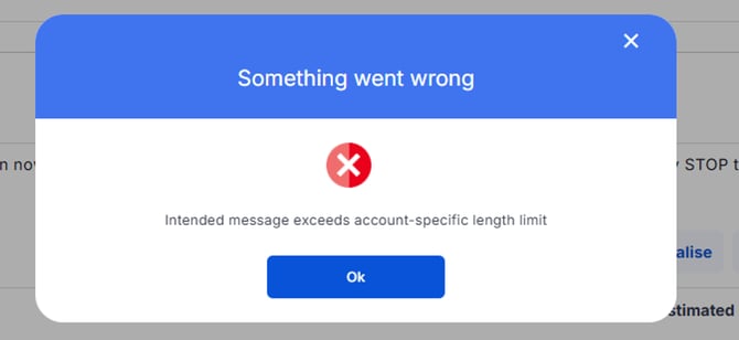 To resolve this, reduce the length of your message so it stays within the allowed number of parts, or contact your Account Owner/Admin to review the current part limit setting.