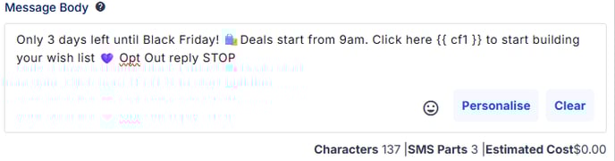 - In the Message Body field: Enter the content of your SMS message. You can personalise each message using personalisation fields such as the recipient’s first name, last name, or custom fields like appointment times or discount codes. You can also include emojis and Unicode characters to enhance your message tone. Please note that using personalisation or special characters may affect the final character count and number of message parts. See SMS Character Limits for more information.