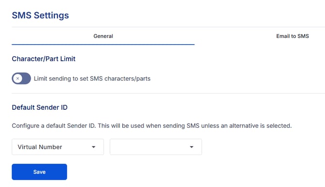 - Default Sender ID: If you have a dedicated virtual SMS number or a SMS Sender ID you can configure a default Sender ID. This will be used when sending SMS unless an alternative is selected.